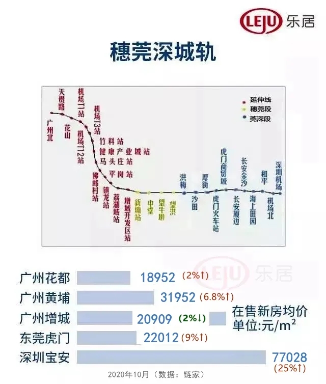 从广州坐高铁去香港的路上,房价也是差距千里。广州南站到庆盛站、虎门站,均价大概在2~2.6万元/㎡,到了光明站价格翻倍,约为4.5万元/㎡。
