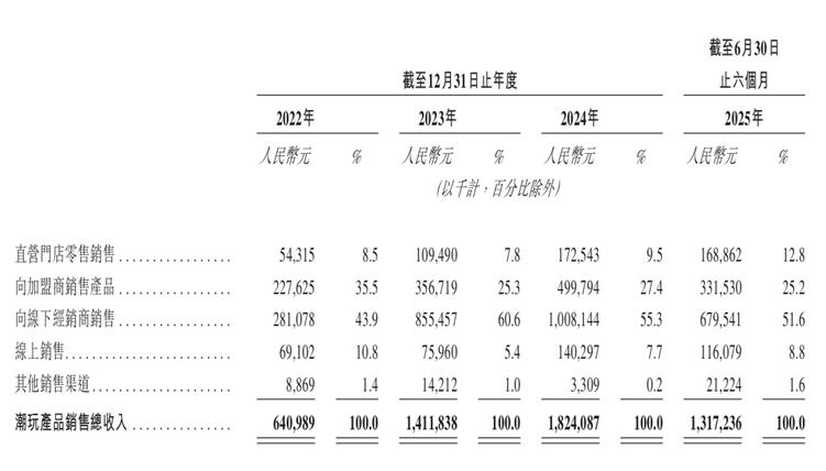 截至2025年中期,TOP TOY共有53家线下经销商,其中最大的一家就是名创优品。报告期内,TOP TOY向名创优品供应潮玩产生的收入,分别占总收入比重为36.8%、53.5%、48.3%及45.5%。