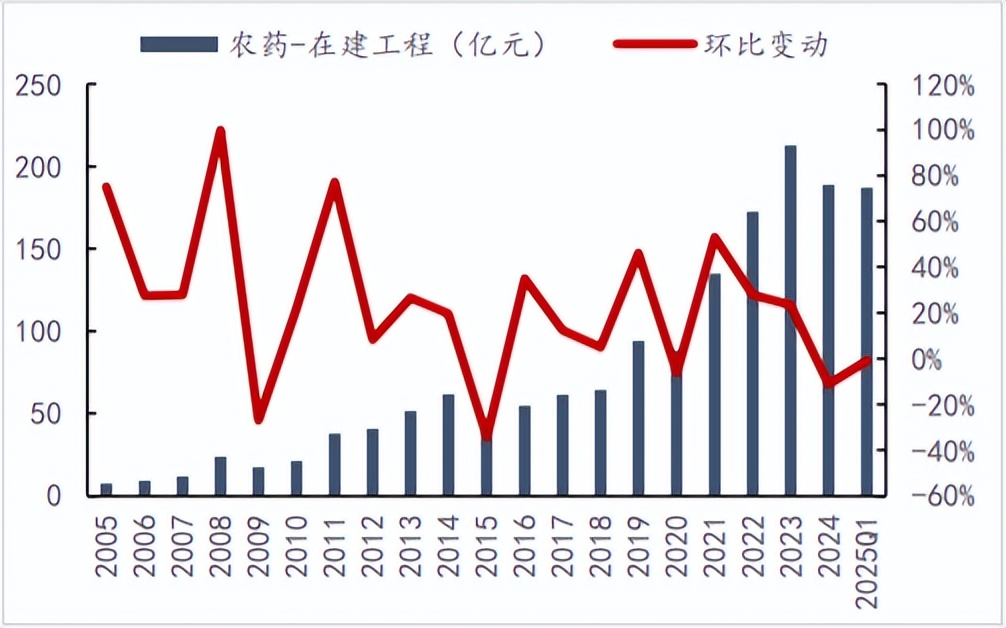 在此大背景下,农药龙头资本开支开始收缩。2024年底,A股农药上市公司在建工程规模同比减少11%。叠加反内卷政策推进,农药供给端已显现收紧迹象。