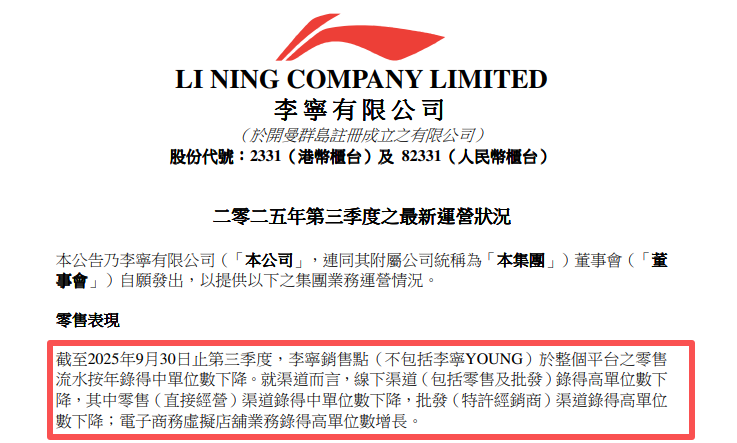 近年来,曾经风光无限的“国潮一哥”李宁,面临明显的业绩压力,归母净利润连续两年下滑。最新2025年三季度运营情况显示,公司线下渠道零售流水出现高单位数下滑,而电子商务虚拟店铺业务录得高单位数增长。