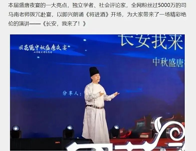9月14日,司马南被邀请作为嘉宾,参加了国花瓷西凤酒在西安大唐不夜城举办的“2024国花瓷西凤酒中秋盛唐夜宴”活动,扮演了“诗仙”李白并进行了朗诵等表演。
