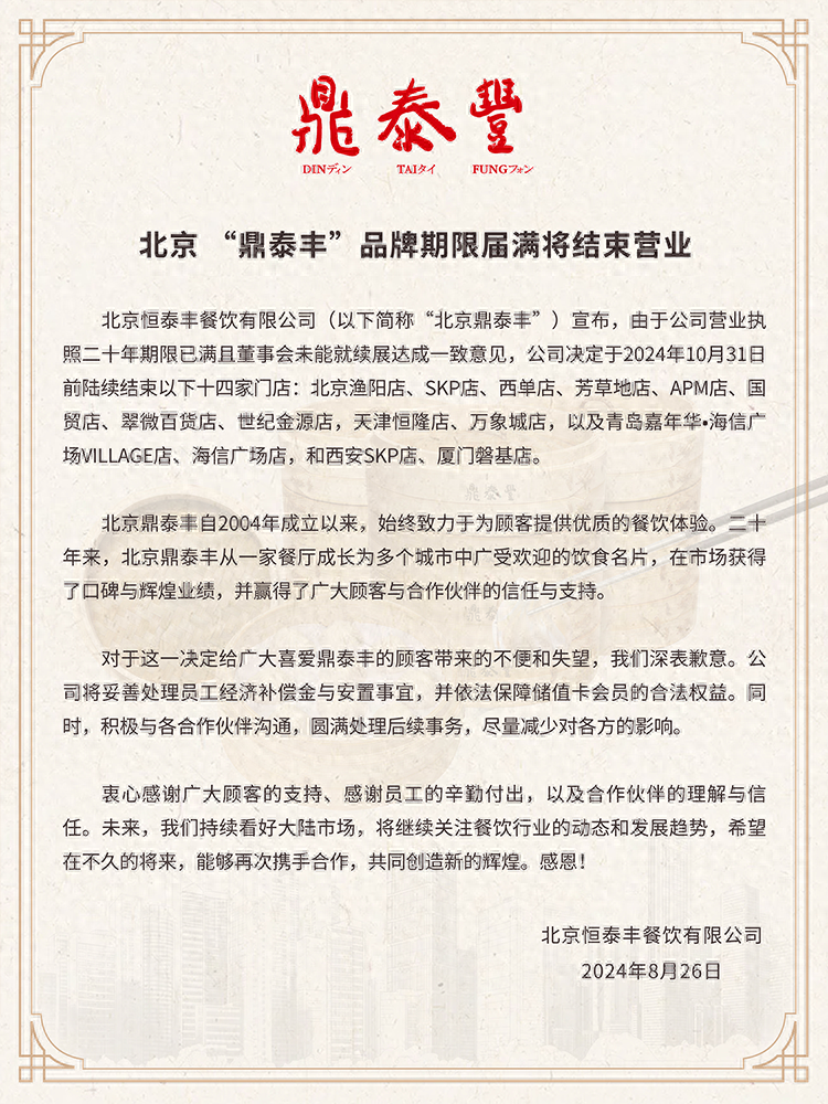 红星资本局8月26日消息,知名餐饮品牌公司北京恒泰丰餐饮有限公司(以下简称“北京鼎泰丰”)发布公告称,由于公司营业执照二十年期限已满,且董事会未能就续展达成一致意见,公司决定于2024年10月31日前陆续结束十四家门店。