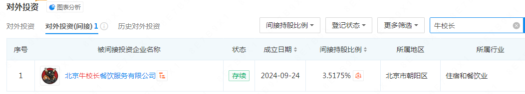 企查查显示,牛校长品牌隶属于北京牛校长餐饮服务有限公司,注册成立时间为2024年9月24日。王思聪旗下普思资本通过间接对外投资的形式获得了该公司超3.5%的股份。抖音账号“王校长的牛排(牛校长版)”发布了多条有关牛校长的短视频,其简介也显示,牛校长品牌的创始人为王思聪。