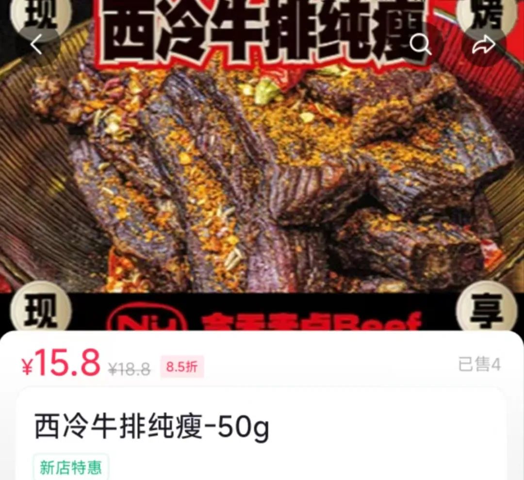 产品方面,根据大众点评等平台的消费者留言,牛校长望京麒麟社店共上架了西冷牛排纯瘦、西冷牛排肥瘦、眼肉牛排三款现烤牛肉干产品,而“现烤牛肉干”实际上是牛排烤好后切成薯条状,用竹签插着吃。