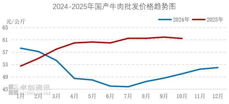 2025年10月,国内牛肉市场价格呈现微降走势。10月,牛肉均价61.44元/公斤,环比下滑0.71%,同比上涨22.88%。