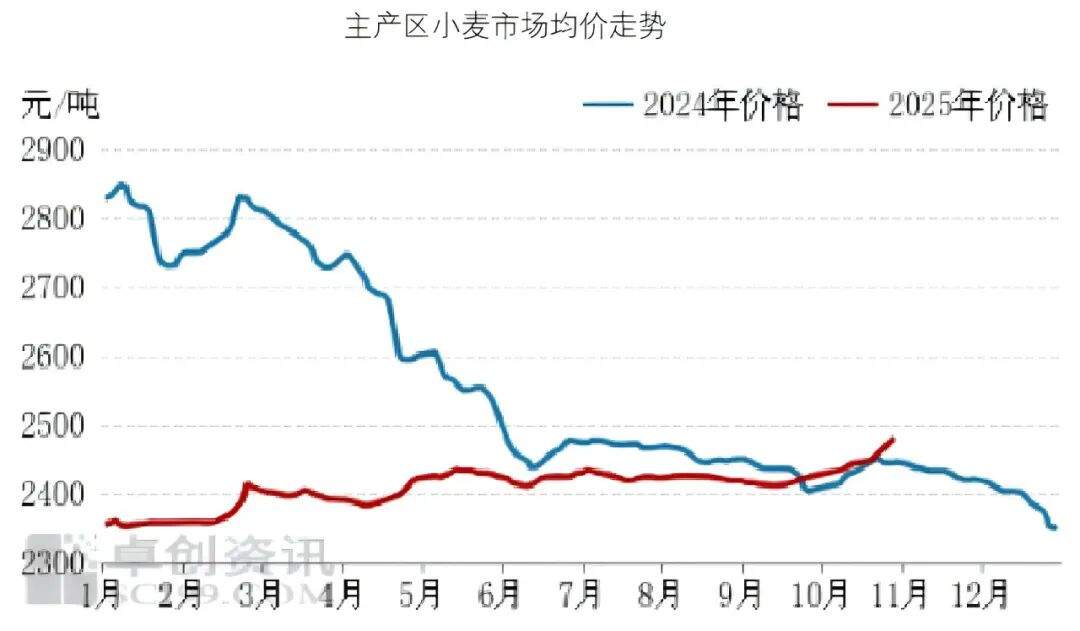2025年10月,小麦市场价格重心维持上移态势。上半月主产区降水天气偏多叠加秋收农忙,市场散粮流通量维持偏低状态,支撑价格上涨。下半月天气影响虽减弱,但秋收秋播关键时期,基层出货积极性不足,且粮商购销重心转向玉米等作物,叠加卖跌不卖涨情绪影响,面粉企业散粮到货量仍偏低,部分原粮库存相对偏紧,进一步提振麦价。但粉企盈利空间不足,限制涨幅。