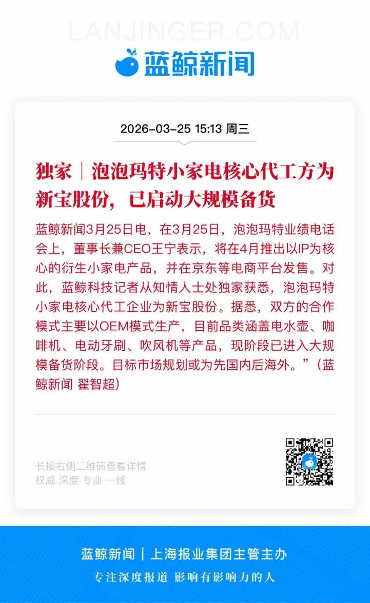 据上海报业集团旗下蓝鲸新闻报道,此次泡泡玛特小家电产品的核心代工厂为国内小家电制造头部企业新宝股份(002705.SZ),双方以OEM模式合作,产品线涵盖电水壶、咖啡机、电动牙刷、吹风机等品类。目前产品已进入大规模备货阶段,目标市场规划为先国内、后海外。受此消息影响,今日新宝股份高开涨停。