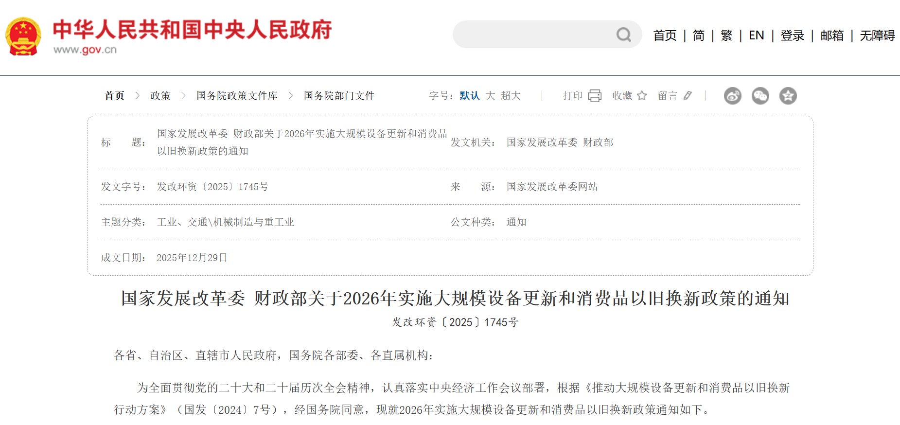 图片说明:关于2026年实施大规模设备更新和消费品以旧换新政策的通知,数据来源于国务院政策文件库