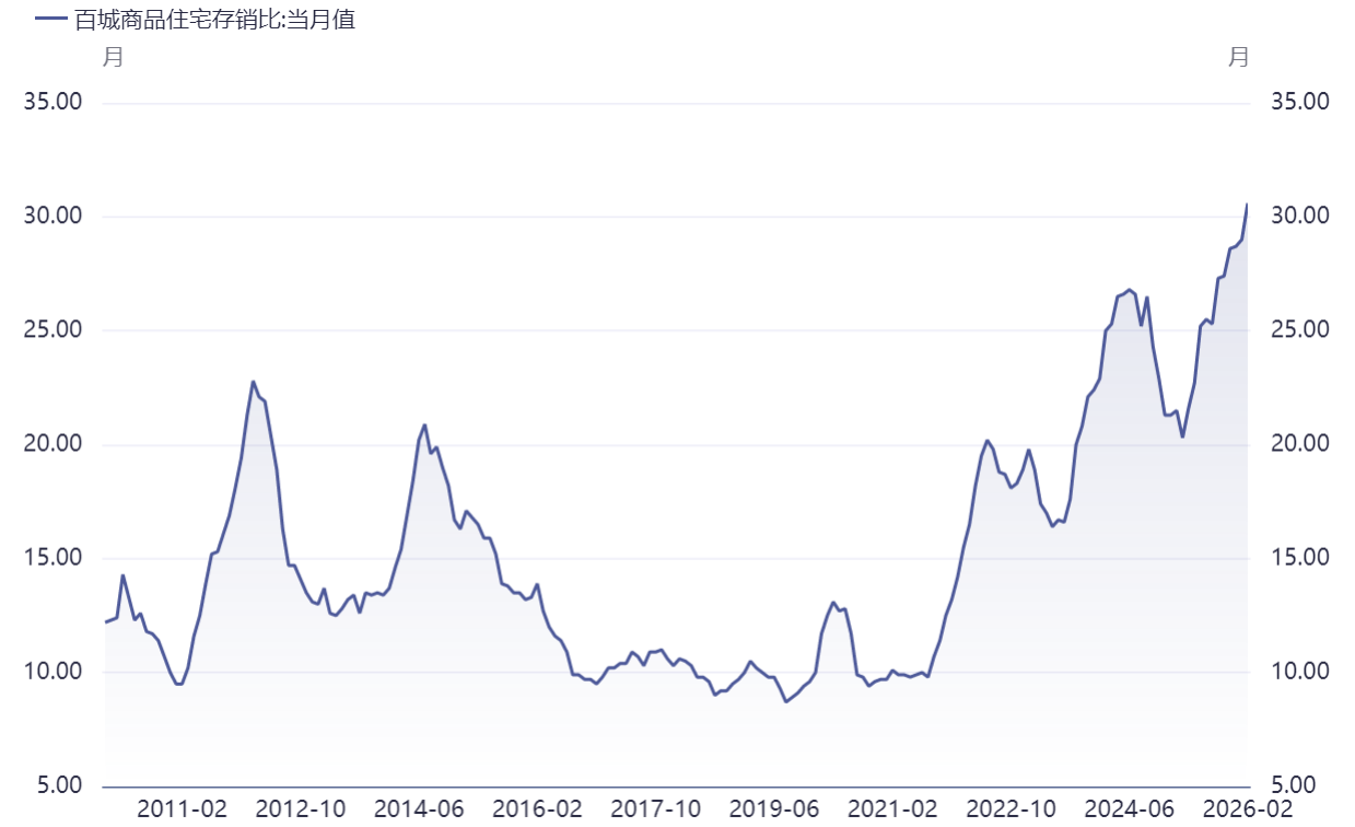 易居房地产研究院数据也印证了库存压力,2026年2月全国百城商品住宅存销比已经超过30,较2024年进一步走高。库存去化周期拉长,意味着房企回笼现金流的压力加大。
