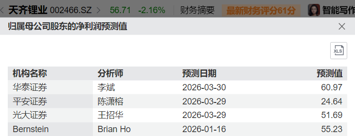 上游碳酸锂。以主营业务最纯的天齐锂业(9696.HK、002466.SZ)为例,市值977亿元,按下图中的平均值计算(去掉异常值),2026年预期净利润55.96亿元,对应动态PE为17.46倍。