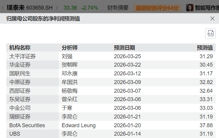 中游负极材料。以市值最高的璞泰来(603659.SH)为例,市值718亿元,按下图中的平均值计算,2026年预期净利润32.50亿元,对应动态PE为22.09倍。