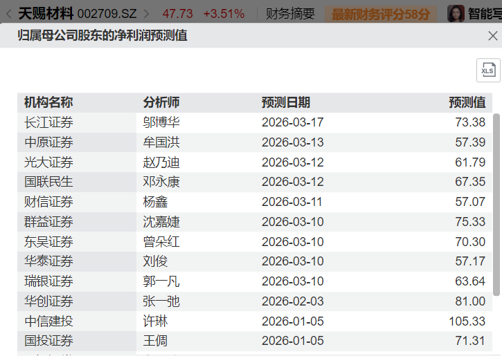 中游电解液等。以市值最高的天赐材料(002709.SH)为例,市值982亿元,按下图中的平均值计算,2026年预期净利润70.09亿元,对应动态PE为14.01倍。