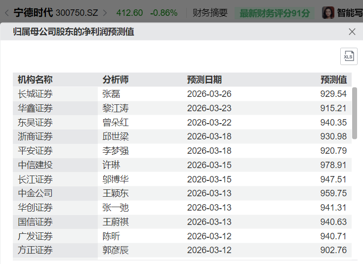 中游电池。以市值最高的宁德时代(300750.SZ)为例,市值18849亿元,按下图中的平均值计算,2026年预期净利润937.37亿元,对应动态PE为20.11倍。