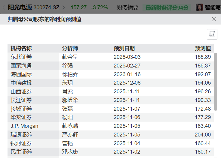 下游大储。以市值最高的阳光电源(300750.SZ)为例,市值3257亿元,按下图中的平均值计算,2026年预期净利润183.65亿元,对应动态PE为17.73倍。