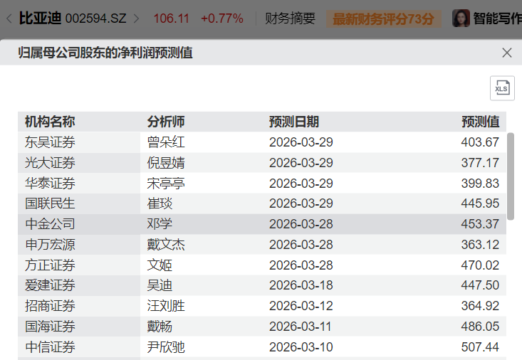 下游电动车。以市值最高的比亚迪(1211.HK、002594.SZ)为例,市值9669亿元,按下图中的平均值计算,2026年预期净利润451.20亿元,对应动态PE为21.43倍。