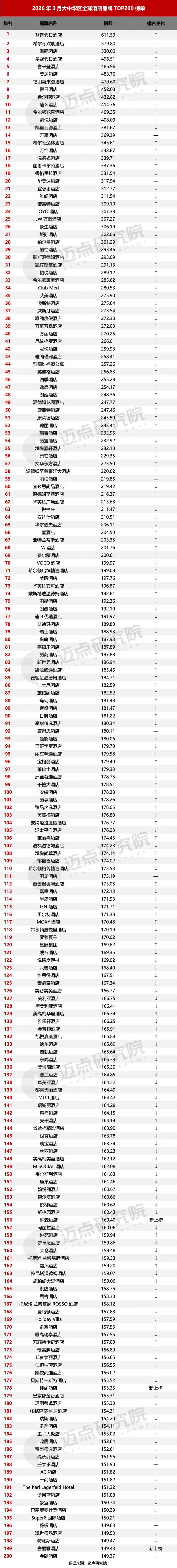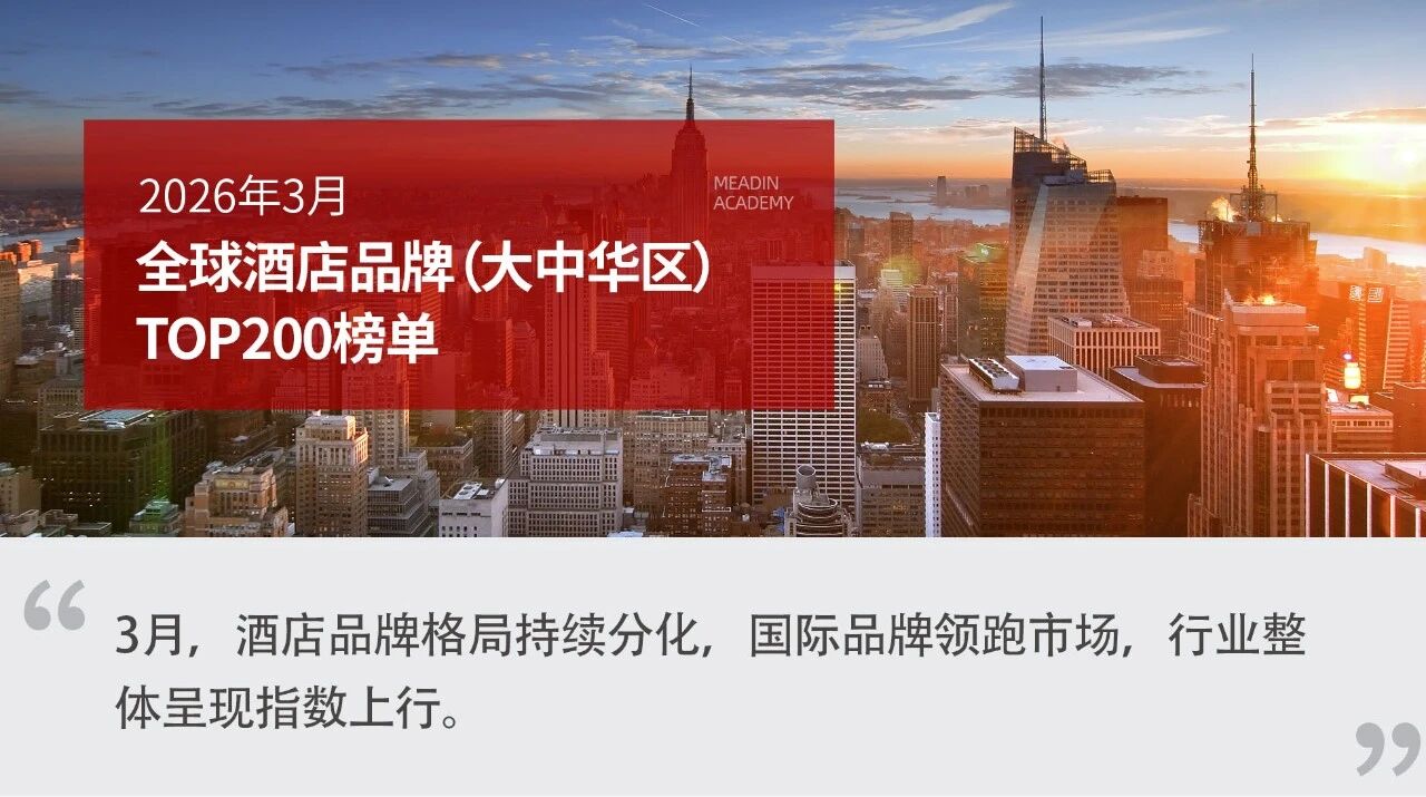 “请2休5”拼假策略驱动游客提前出发,错峰踏青。携程数据显示,截至3月底,酒店搜索热度已显著高于去年,并且国内酒店预订间夜量同比增长约40%,足以表现出节假日消费者的消费需求持续走高,时长充沛的假期更能带动消费。 高颜值的景观逐渐成为出行驱动力,进一步刺激文旅及住宿业消费。例如,杭州西溪湿地举办花朝节,利用春日盛景吸引游客并带动周边文旅及住宿消费。飞猪平台数据显示,3月赏花季期间,踏青赏花搜索热度暴涨380%,并且已有单体酒店创下千万元销售纪录,这足以说明季节性休闲需求已成为拉动酒店文旅市场增长的重要动力。 以下是2026年3月大中华区全球酒店品牌TOP200完整榜单——