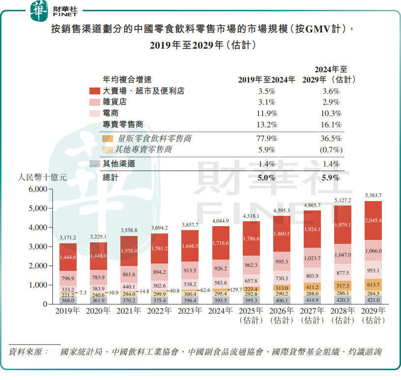 灼识咨询资料显示,2024年,中国零食饮料整体市场规模达到4.0万亿元。在零食饮料零售行业,量贩零食饮料零售占比低于5%,渗透率显著低于美国及德国等成熟市场。与此同时,量贩零食饮料零售是增长最快的渠道,2024年至2029年年均复合增速预计达36.5%。