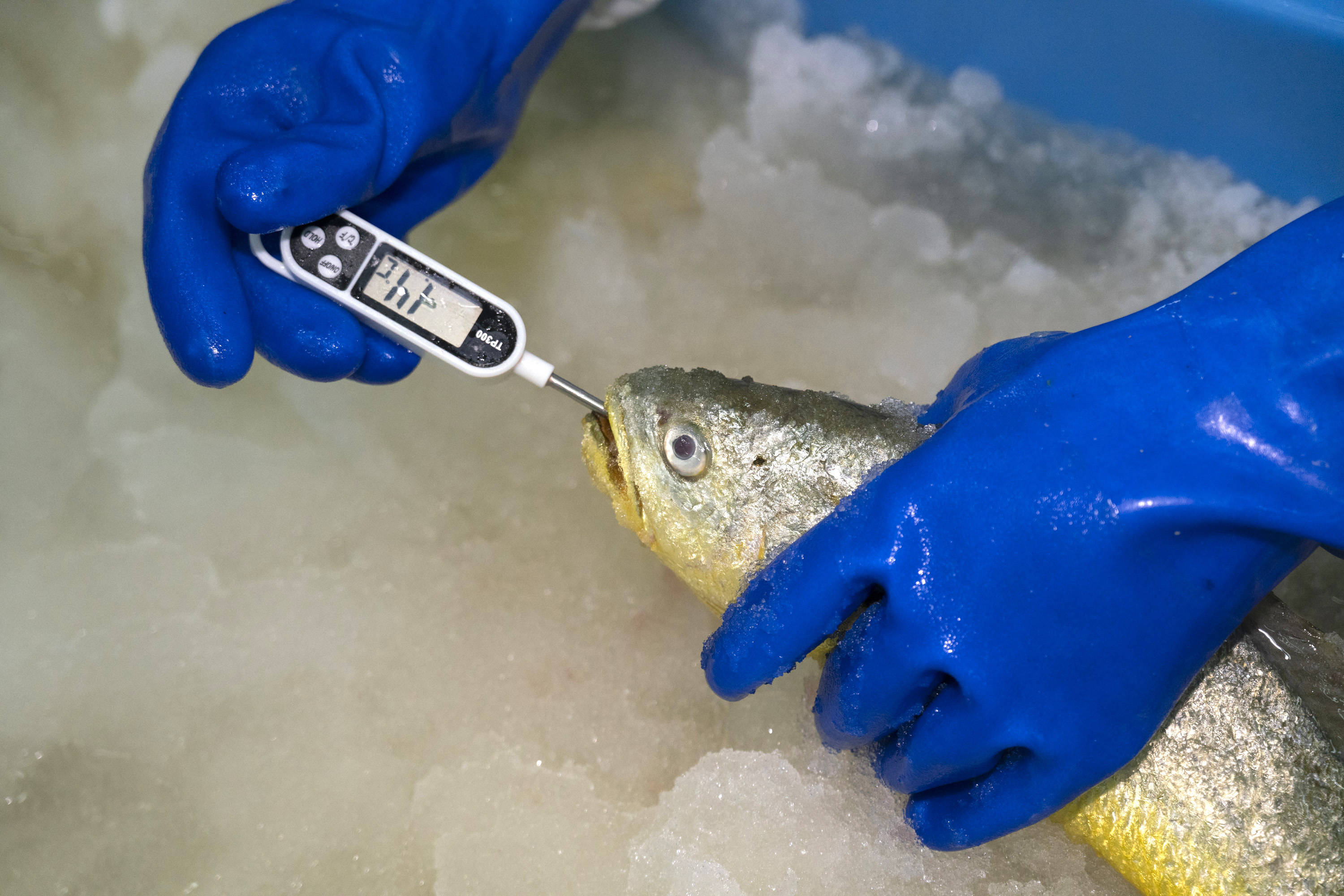 一是标准共建,定义出厂品质。小象超市独创了“三测四看”流程,在原料区、加工区、包装区,对鱼体温度进行三次检测,始终按照温控要求执行。同时,通过固定的流程,检验鱼体表粘液、眼球澄明度、鳃丝色泽与鱼体完整性,这些曾经依赖老师傅经验的感性判断,被转化为必须记录在案、可追溯的检查项。